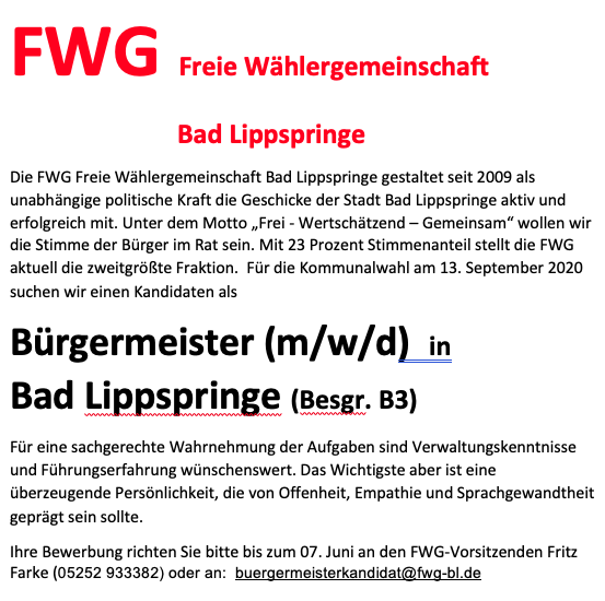 Bad Lippspringe. Kürzlich war bekannt geworden, dass die Freie Wählergemeinschaft Bad Lippspringe mit Thomas Lüer einen möglichen Kandidaten für die