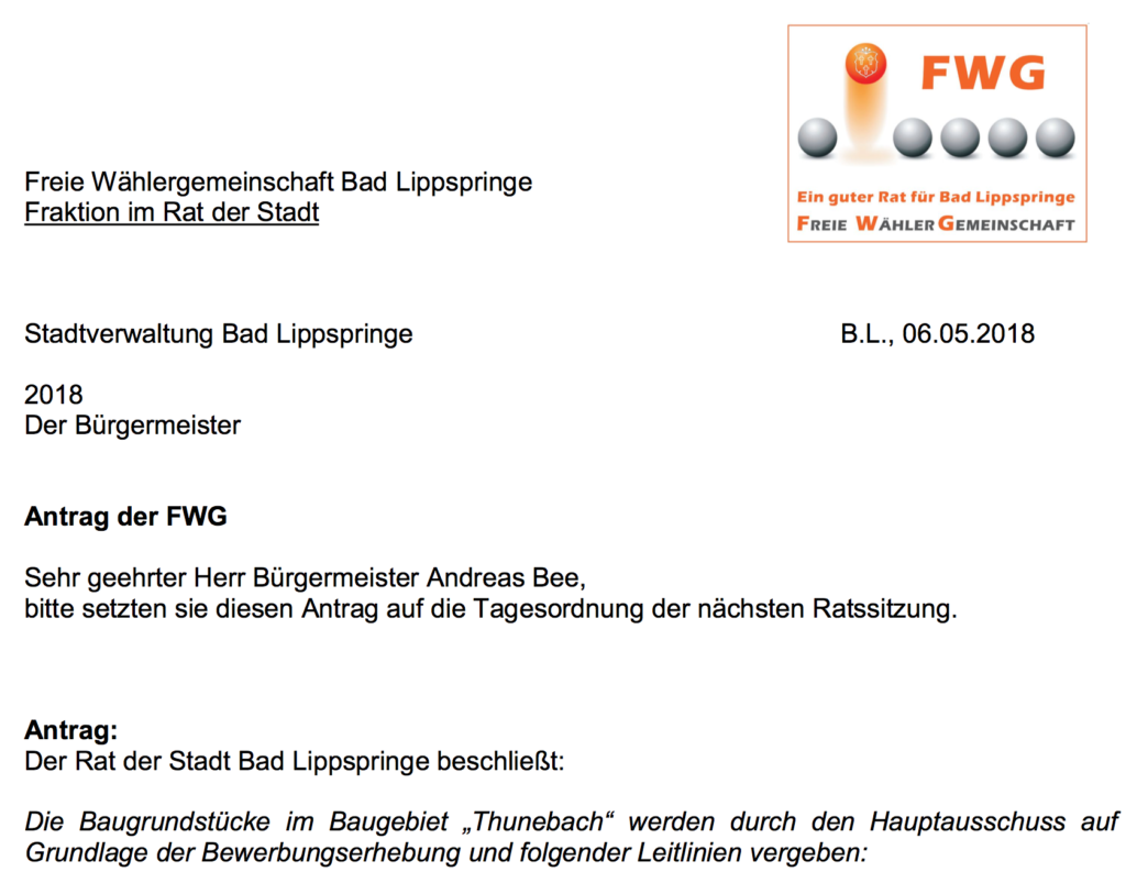 Bad Lippspringe. Die FWG wagt einen Vorstoß im zurzeit laufenden Vergabeverfahren von Baugrundstücken im Baugebiet An der Thune. Wir haben