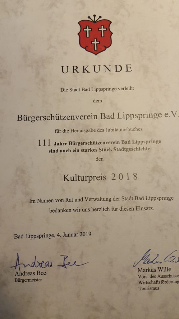 Bad Lippspringe. Der Kulturpreis für das Jahr 2018 geht an den Bürgerschützenverein Bad Lippspringe für die 111jährige Chronik und Stadtgeschichte. […]